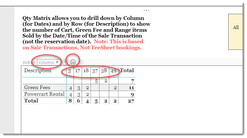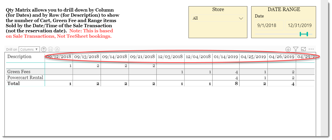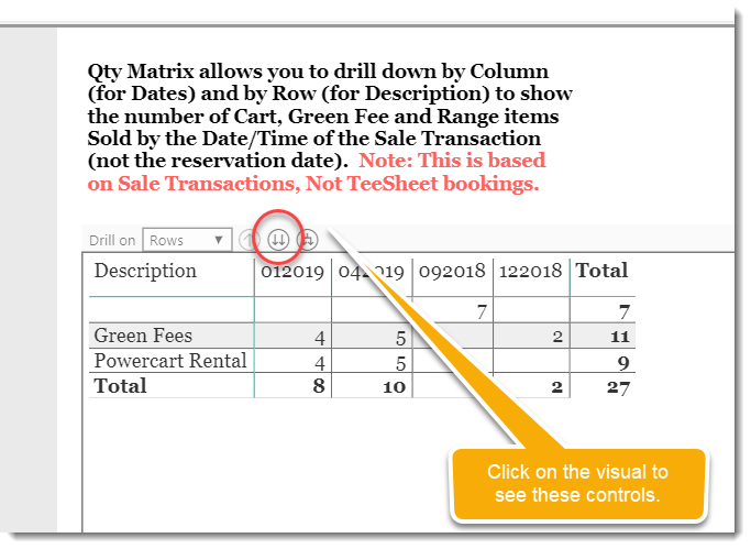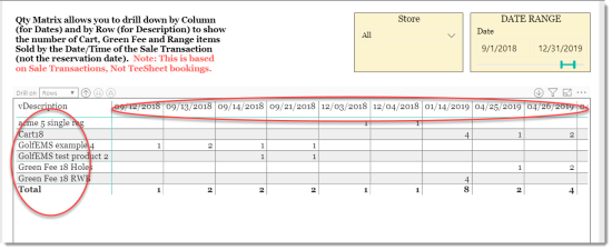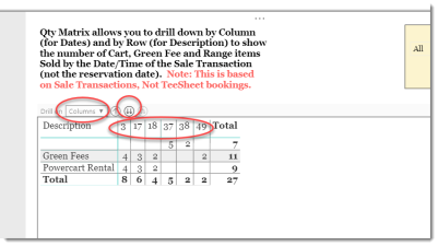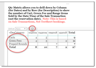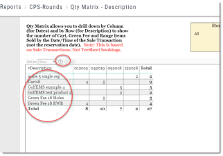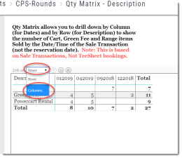 The Qty Matrix - Description is a matrix report which provides a unique feature to drill down thru data by both Columns and Rows. This report provides the Quantity of Items sold in a given time frame and will allow you to drill down thru different levels of description and dates.