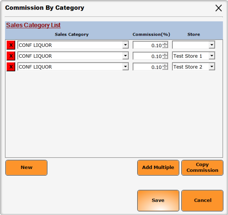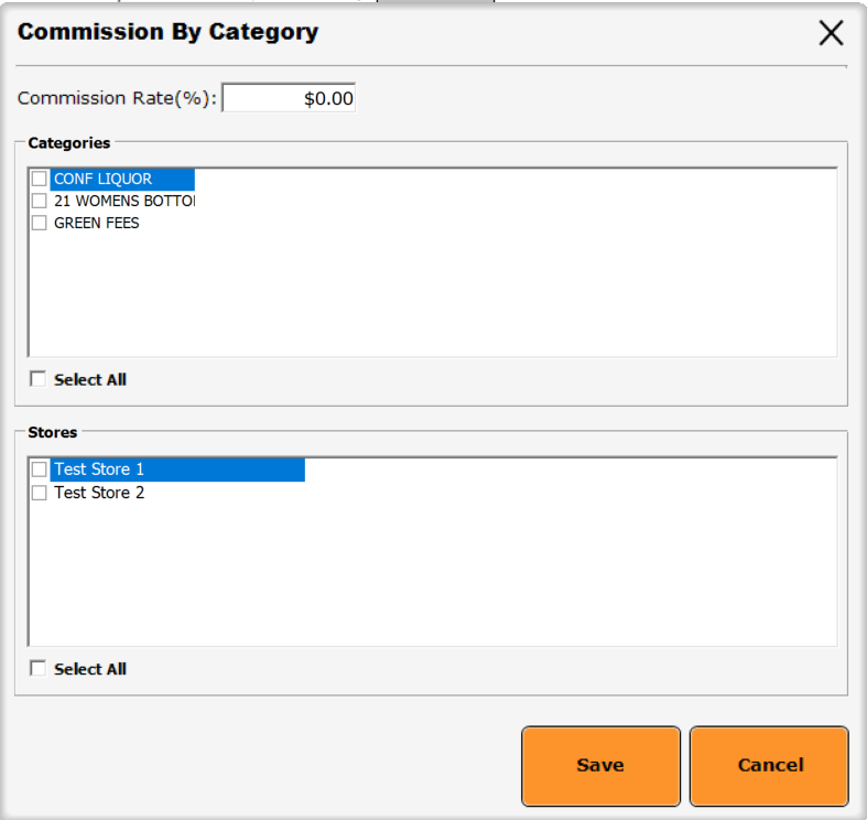 (Optional) If you would like to assign different commission percentages to different categories, select the Commission by Category button to the right. A Commission By Category pop-up displays.