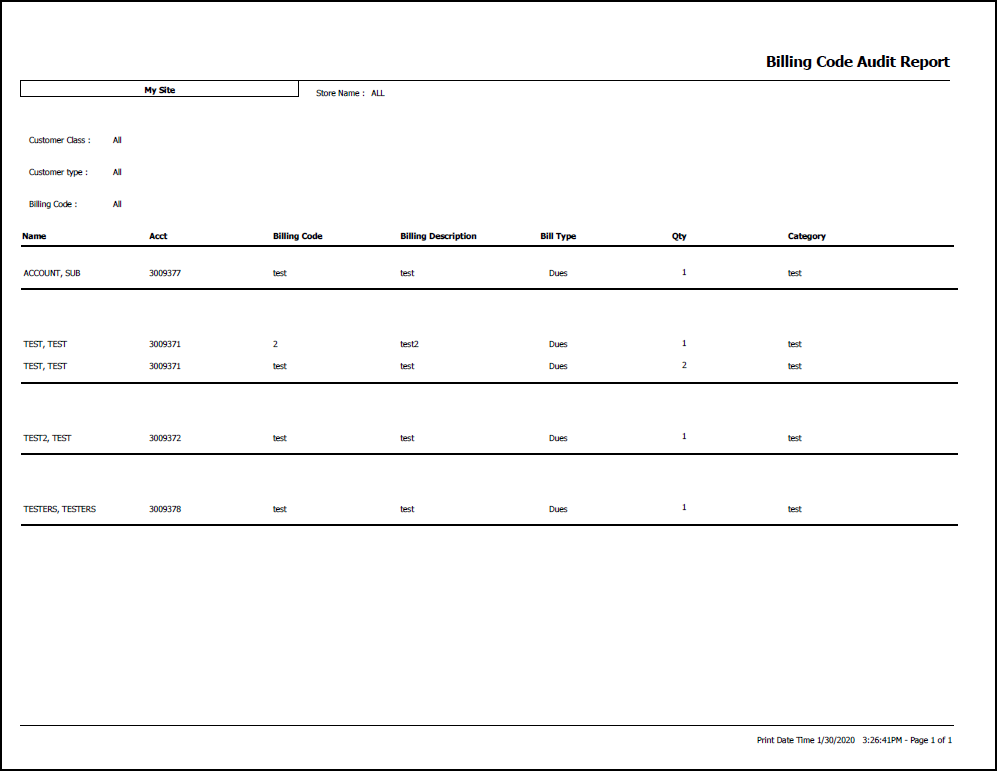 The Billing Code Audit report shows what billing codes, minimums, min credits, and assessments are attached to each member. The billing code audit report would show all billing codes that are attached to the customer in the reoccurring charges tab in their customer profile.