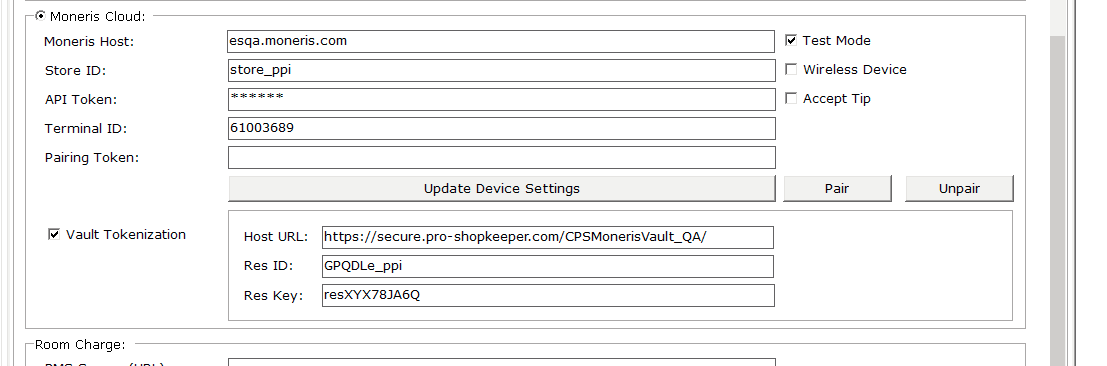 In the Moneris Cloud section, select the Vault Tokenization checkbox, and enter the following for Moneris processing: